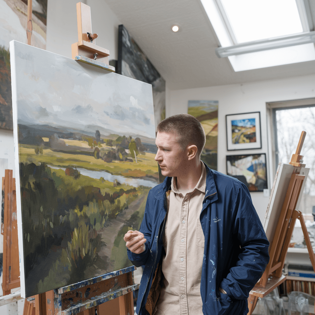 Liam's evocative landscapes celebrate the raw beauty of the Irish coastline and countryside. His Wabi Sabi aesthetic embraces imperfection, bringing a touch of rugged charm to living rooms and offices with horizontal and panoramic pieces in greens, blues, and greys.