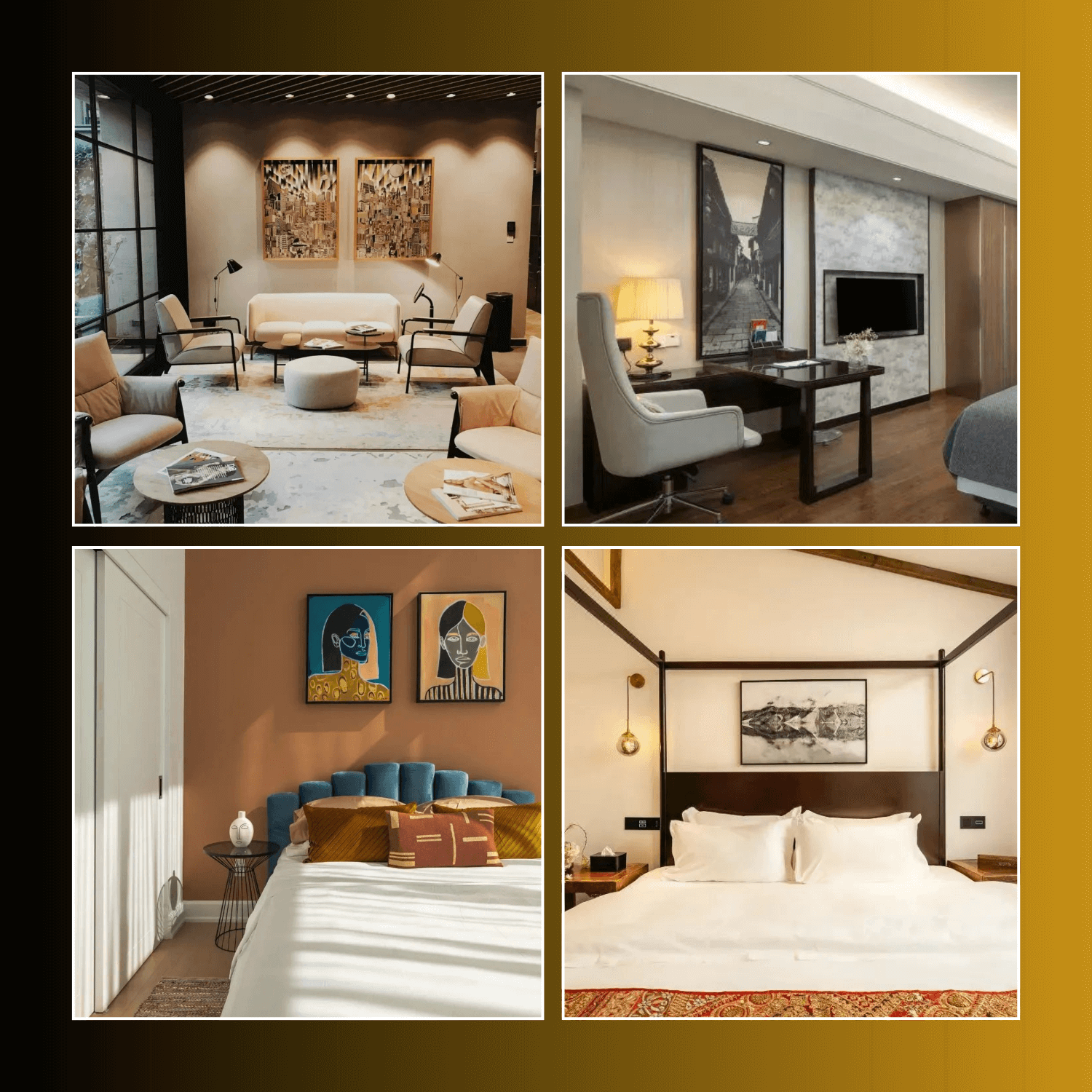 Montcarta's art selection beautifully complements the Silver Springs Grand Hotel, enhancing the guest experience. The lobby's textured art pieces create a warm and inviting welcome. The portraits in the guest rooms add a touch of modern sophistication and personality, while the landscape art above the bed creates a serene and restful ambiance. The diverse styles chosen reflect the hotel's commitment to providing a unique and memorable stay.