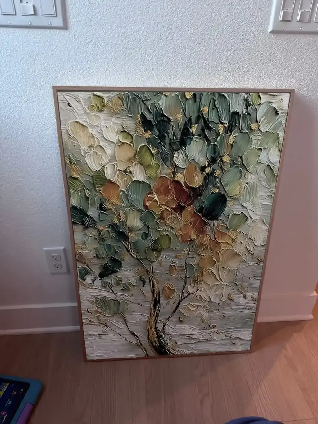 Very pleased with my new artwork. Colors and textures are as advertised. Beautiful shades of sage. It is the focal point of my living room. Artwork is securely packaged.