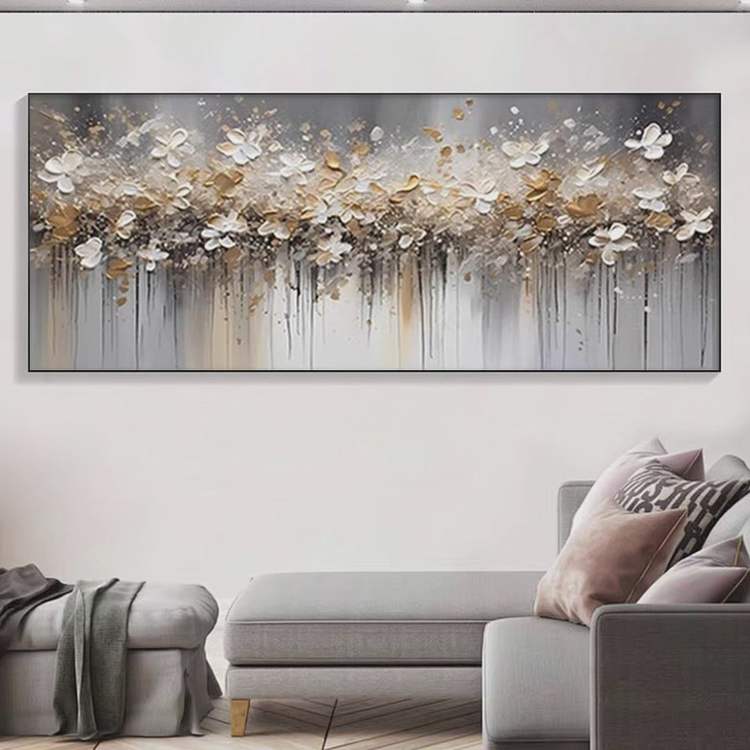Golden Drift is a mesmerizing abstract floral painting featuring delicate white blossoms accented with shimmering gold. Elodie Dubois's signature soft, impressionistic style creates a dreamy and romantic atmosphere. This horizontal panoramic piece adds a touch of Parisian elegance to any living room, bedroom, or dining area.