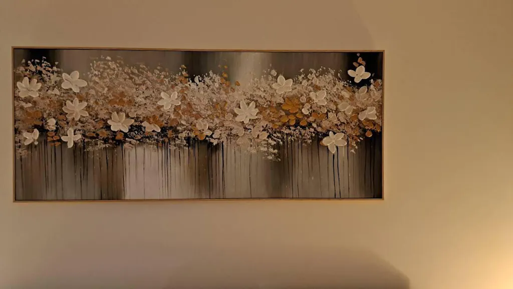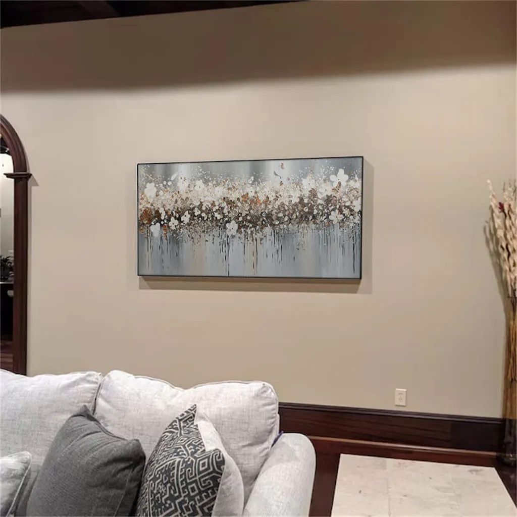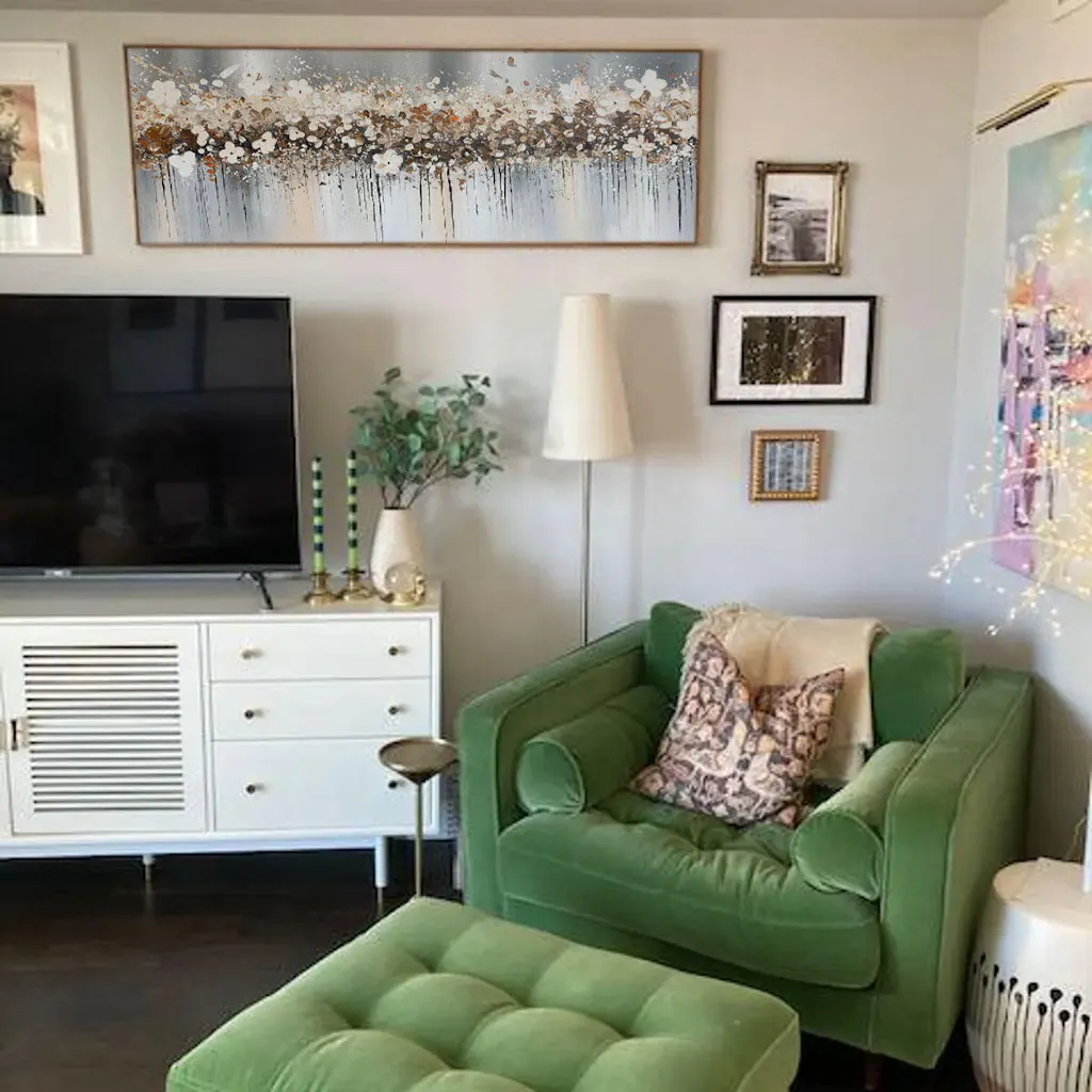Golden Drift is a mesmerizing abstract floral painting featuring delicate white blossoms accented with shimmering gold. Elodie Dubois's signature soft, impressionistic style creates a dreamy and romantic atmosphere. This horizontal panoramic piece adds a touch of Parisian elegance to any living room, bedroom, or dining area.