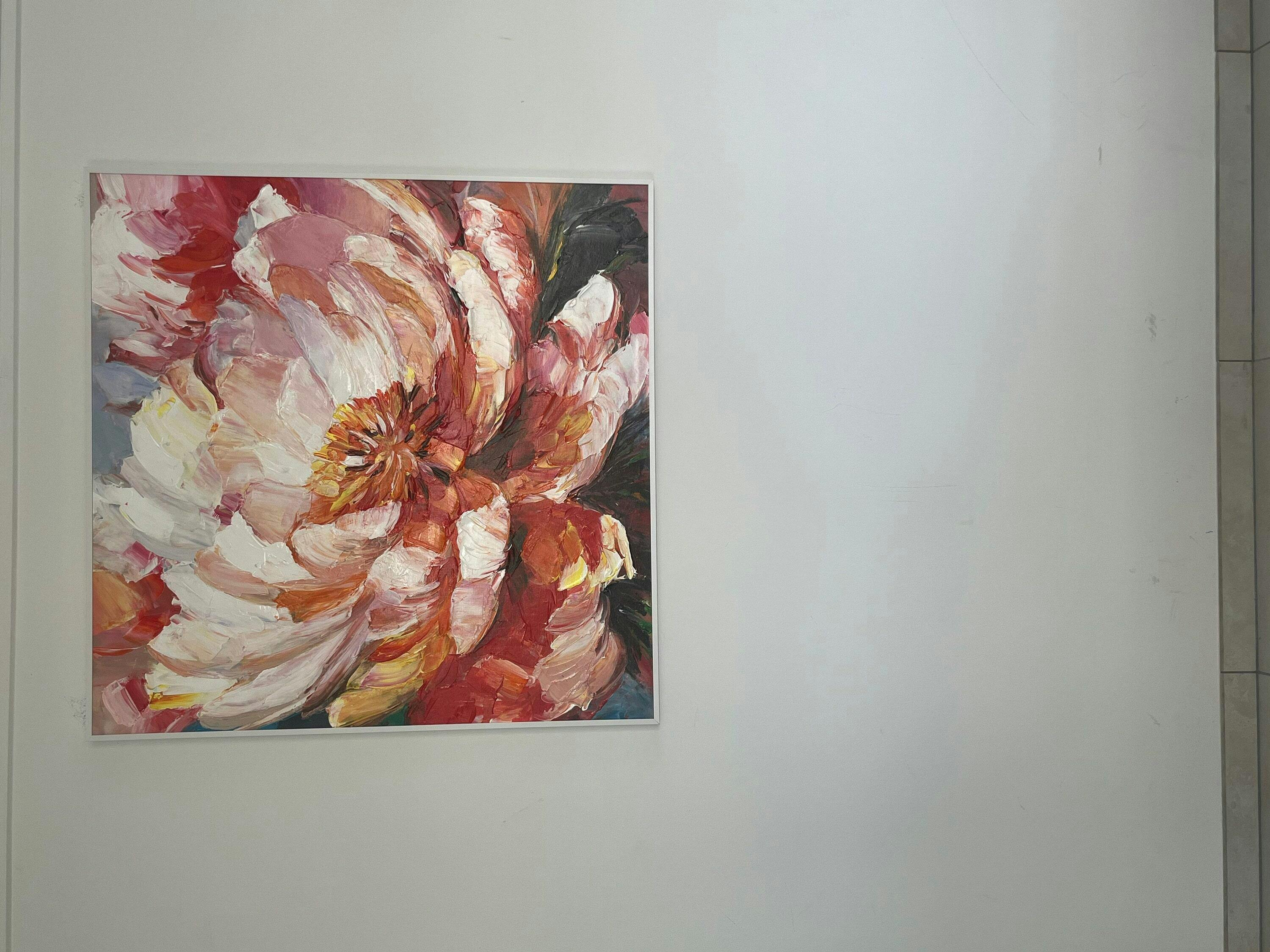 Blooming Peony by Isabella Rossi showcases a large, textured peony bloom in vibrant shades of pink and orange. This square artwork brings a touch of Italian artistry and natural beauty to any living room, bedroom, or dining room. Isabella Rossi's textured canvases, often created with a palette knife impasto style, evoke warmth and nostalgia. This painting is perfect for adding a touch of floral elegance and artistic flair to any space.