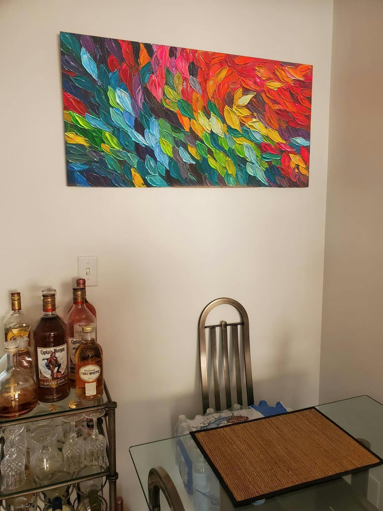 Experience a burst of color and texture with "Chroma Whispers"! This vibrant impasto oil painting showcases a dazzling array of hues, creating a sense of movement and energy. Let the abstract composition speak to your imagination and add an enticing touch to your living room, dining room, or office space.