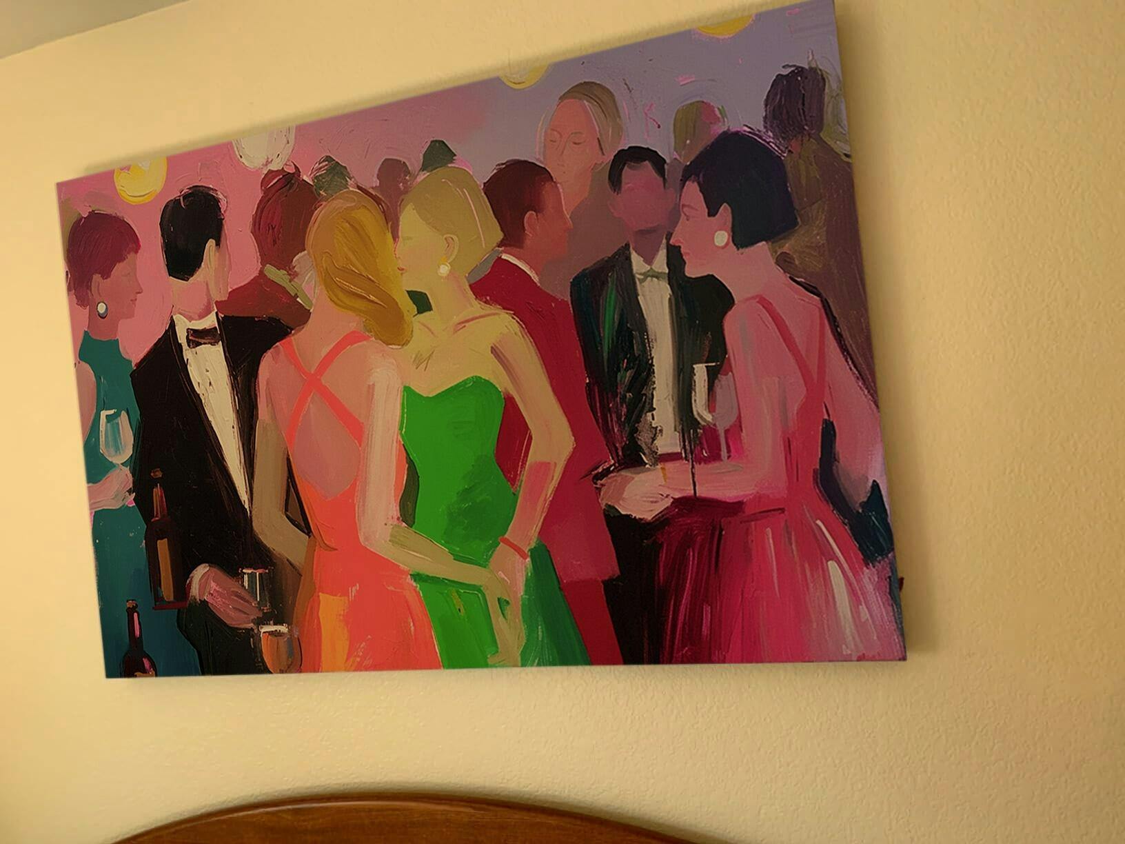 “Cocktail Hour” captures the electric energy and vibrant social dynamics of a sophisticated gathering. Loose, expressive brushstrokes in a bold, colorful palette depict a lively scene of elegantly dressed figures mingling and conversing. The warm pinks and oranges create a sense of warmth and intimacy, while the dynamic composition captures the movement and flow of the party. This piece adds a touch of glamour and sophistication to dining rooms, living rooms, or entertainment spaces. The figurative style, focus on social scenes, and vibrant colors align with Chak Yu Lam’s artistic sensibilities.
