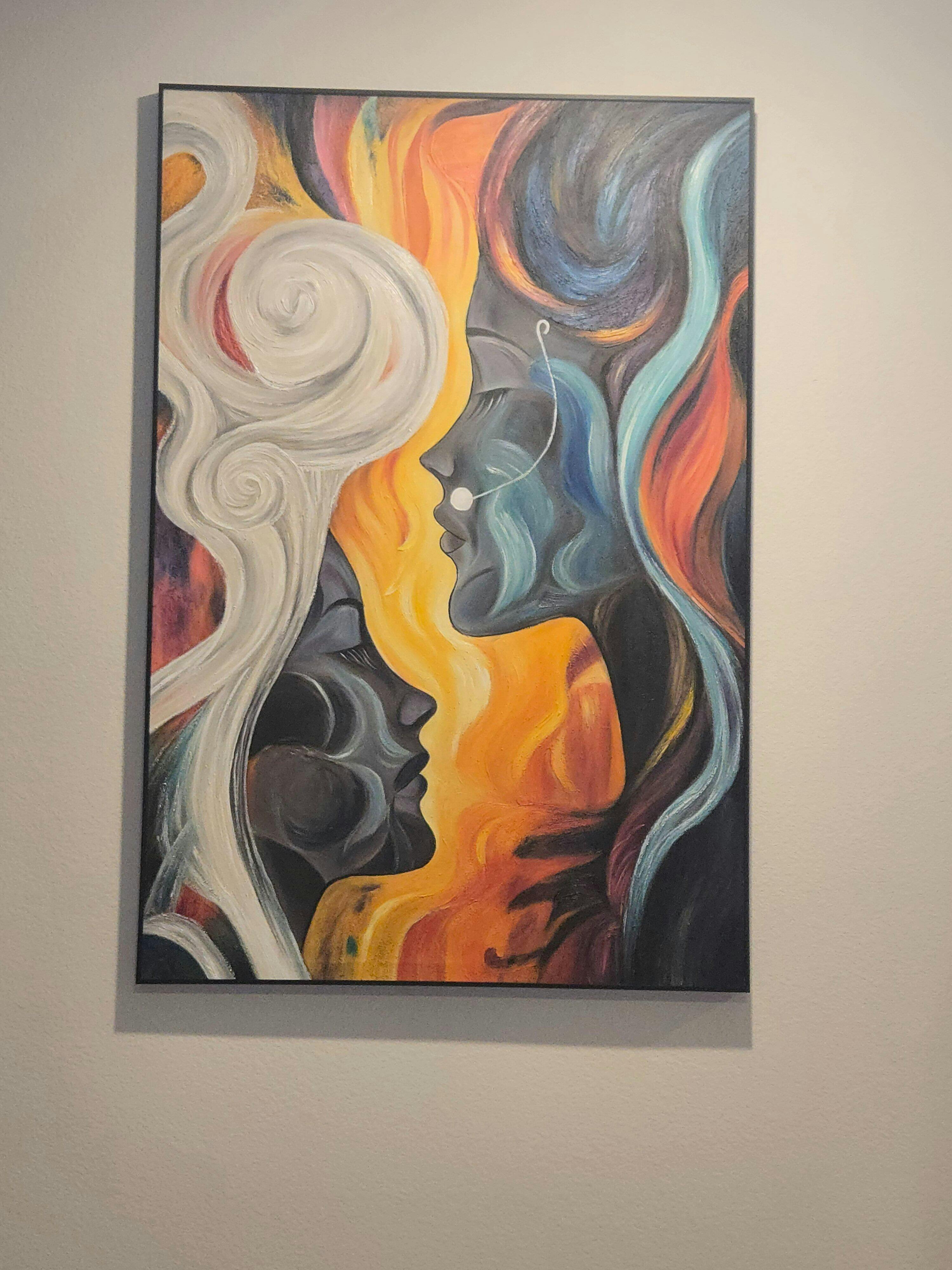 "Connected Souls" is an original oil painting that delves into the complexities of human connection. The two faces in profile, rendered against a vibrant, swirling background, evoke a sense of intimacy and shared emotion, inviting viewers to contemplate the duality and interplay of human relationships. This vertical piece is a perfect addition to any living room, bedroom, or personal space, adding a touch of artistic depth and emotional resonance to your décor.