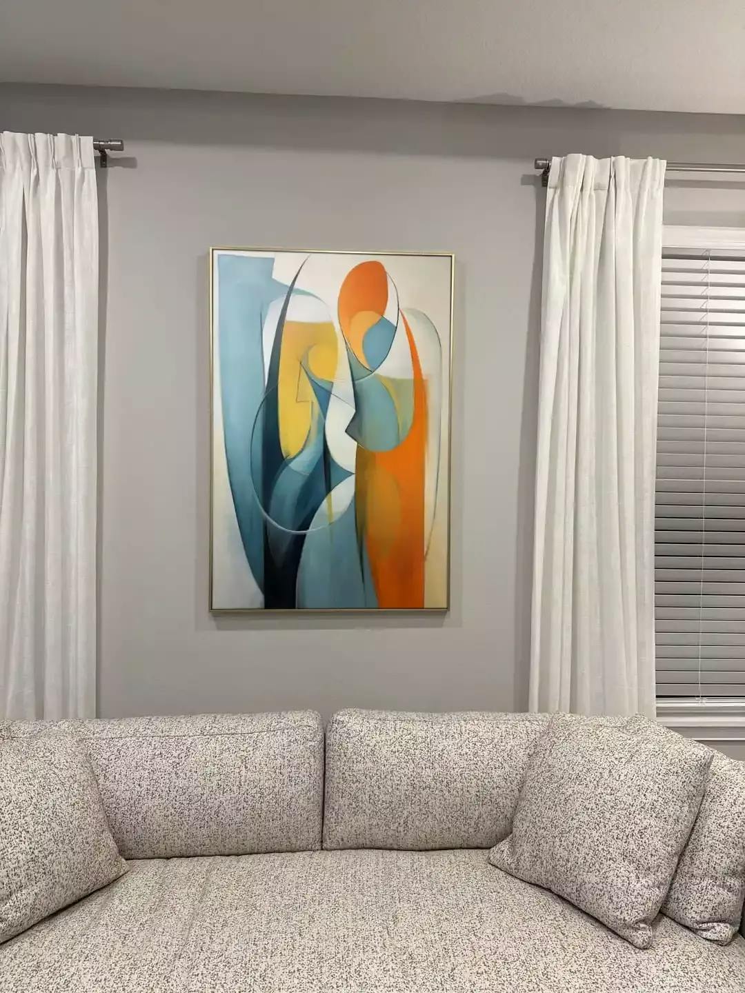 Feel the vibrant energy of "Convergence," a stunning abstract piece where forms and colors intertwine in a captivating dance. Bold strokes of radiant orange and yellow embrace cool, calming blues, creating a dynamic visual narrative of connection. The fluid, overlapping shapes suggest two figures in a harmonious moment, making it a powerful statement on unity. This sophisticated artwork is perfect for adding a touch of contemporary flair and sparking conversation in a living room, hallway, or modern office space