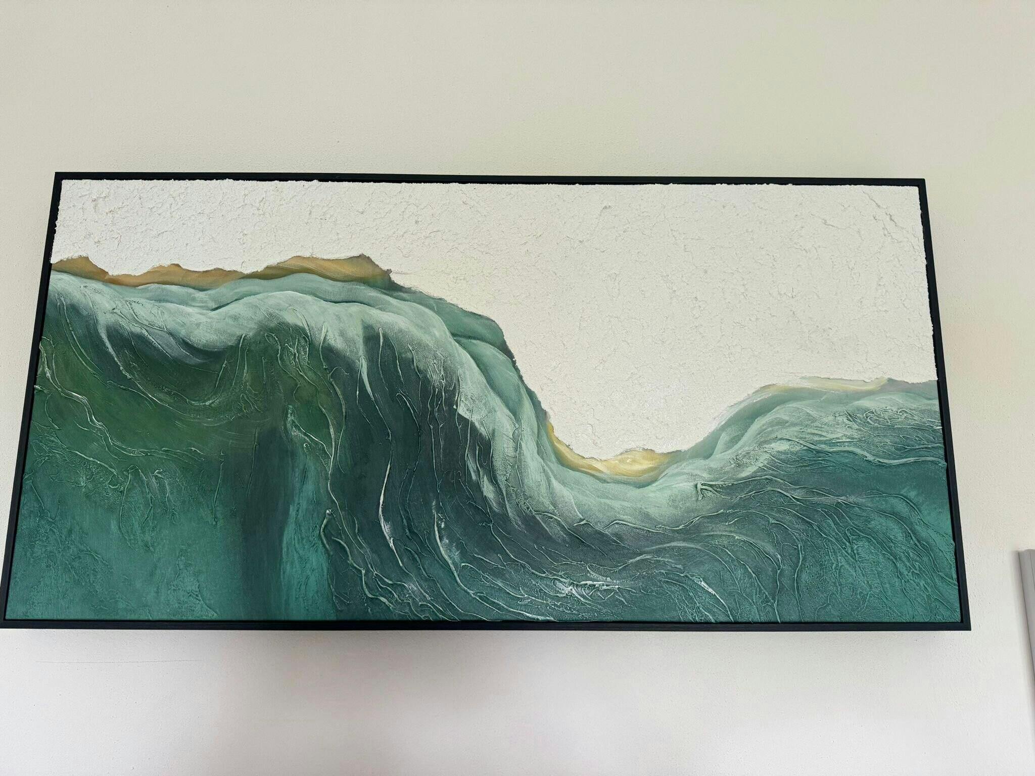 "Emerald Depths" by Liam O'Connell is a captivating abstract seascape that evokes the raw, untamed beauty of the ocean. The textured waves in shades of emerald green and white create a dynamic and serene atmosphere, inviting viewers to immerse themselves in the rhythmic ebb and flow of the tide. This panoramic canvas is perfect for adding a touch of coastal elegance and a sense of peaceful contemplation to any living room, bedroom, or office space. Imagine this piece transforming your living room into a tranquil seaside escape, its textured surface and cool colors evoking the refreshing sea breeze and the soothing sounds of crashing waves. The panoramic format emphasizes the vastness of the ocean and the dynamic movement of the waves, creating a sense of serene immersion.