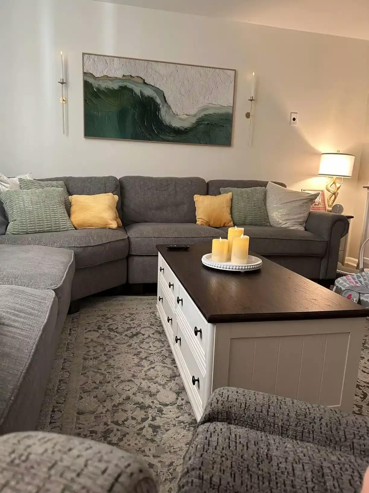 Cute painting I got for a rental. I was a little nervous about it but I think adds a lot to the space. It was easy to install and felt like good quality for what I got. It didn’t feel to heavy and the supplies to hang it felt sufficient.