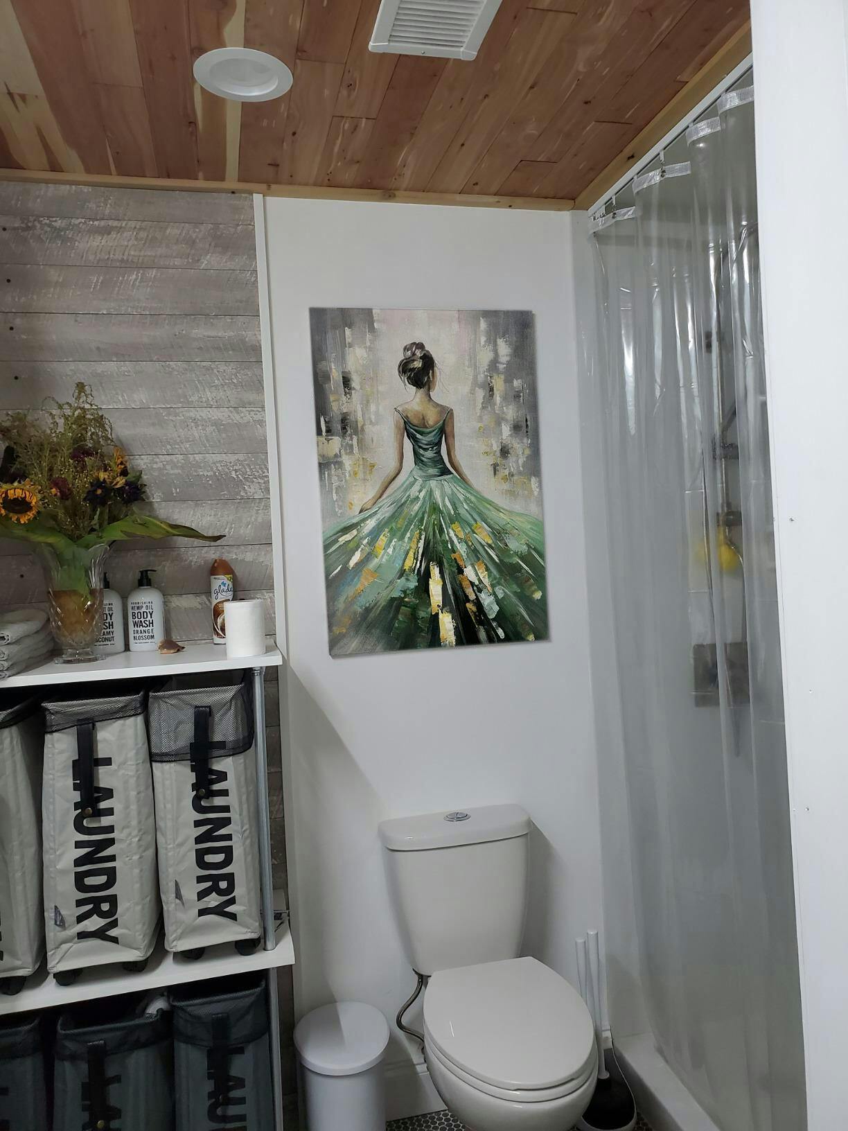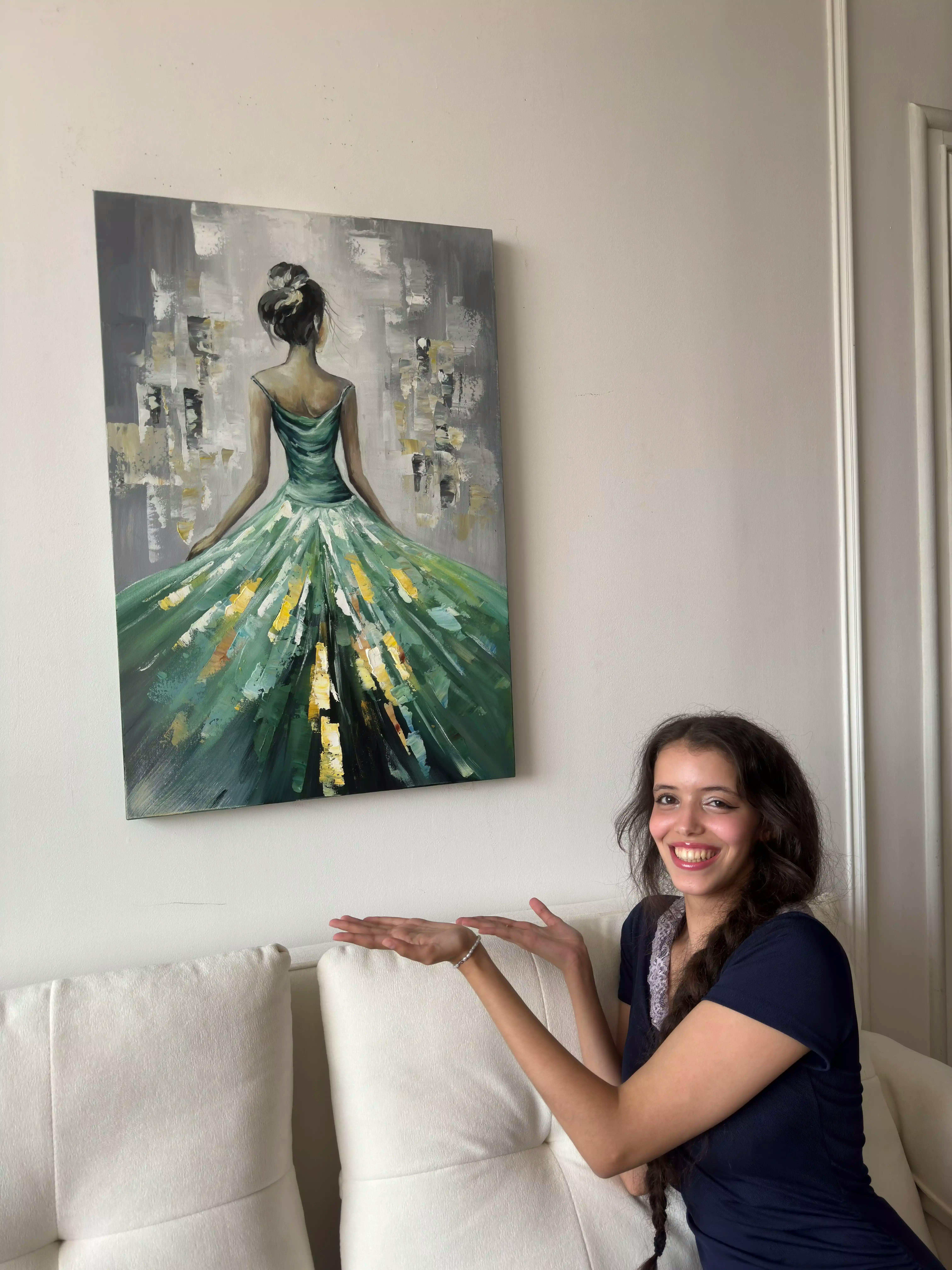 "Emerald Grace" by Yan Nan Li is a captivating vertical painting that exudes elegance and grace. The flowing green dress, accented with gold details, creates a sense of movement and ethereal beauty. This vertical canvas is perfect for adding a touch of artistic sophistication and a feminine touch to any living room, bedroom, or hallway. Imagine this piece transforming your bedroom into a tranquil and inspiring space, its soft color palette and graceful composition creating a calming and restful ambiance. The vertical format emphasizes the flowing lines of the dress and the elegant posture of the woman, creating a sense of refined beauty and visual harmony.