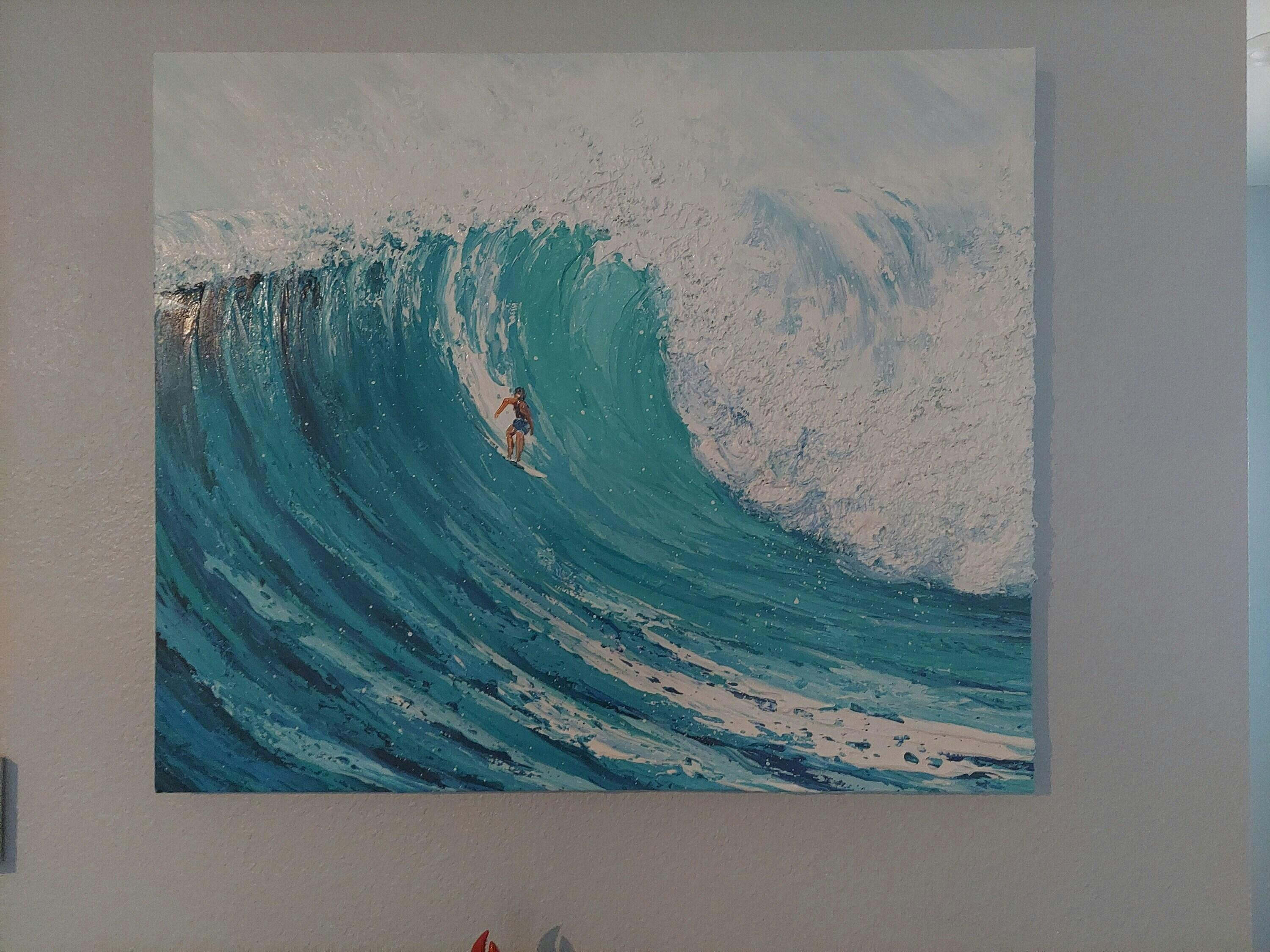 EMERALD SURGE: Textured Blue Ocean Wave Painting with Surfer