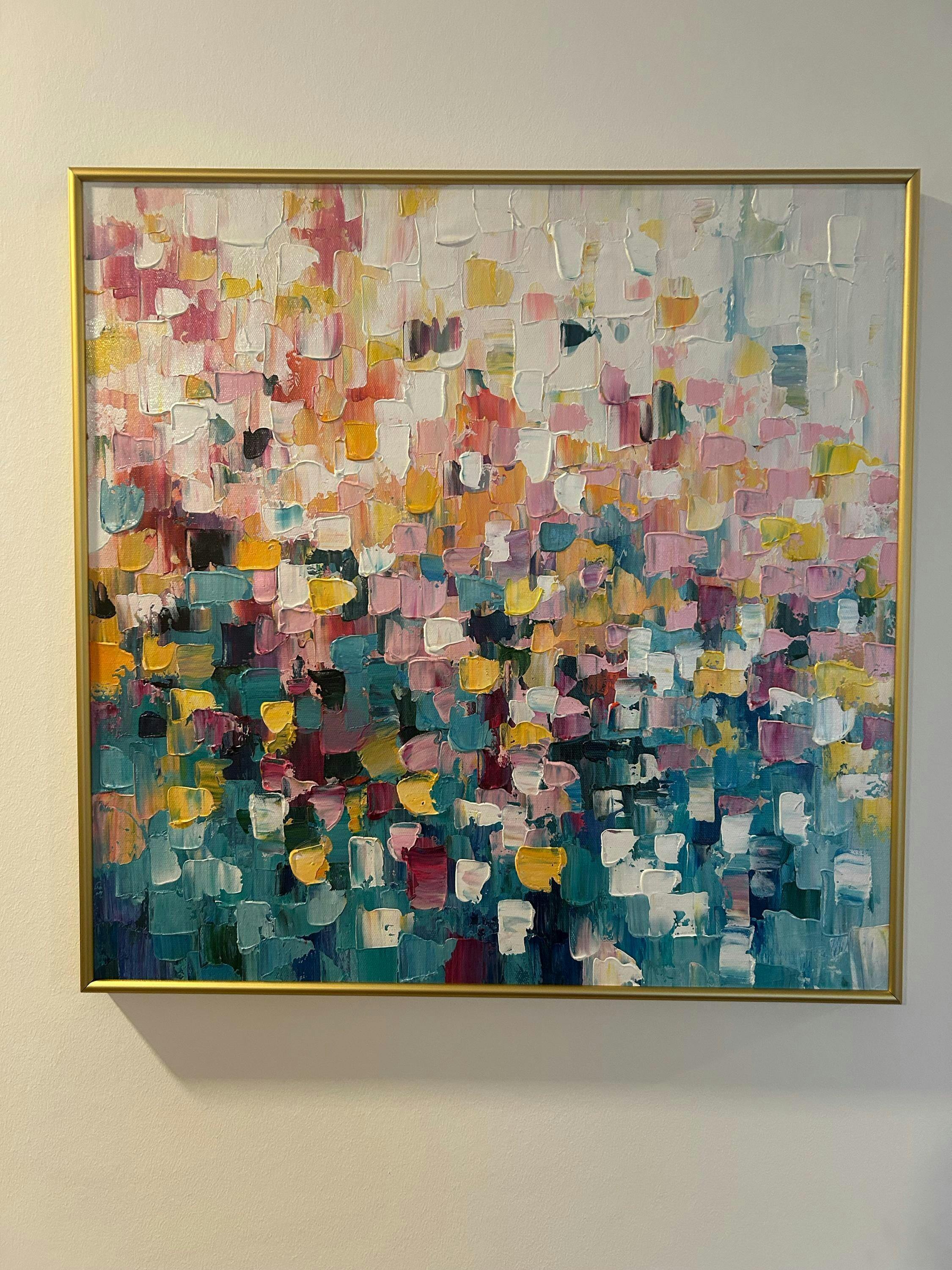 "Field of Dreams" by Willow Davies is a captivating square painting that evokes a sense of joy and wonder. The textured impasto strokes create a stunning abstract composition in a symphony of vibrant hues, bringing a touch of modern artistry and whimsical charm to any space. Imagine this piece transforming your living room into a cheerful and inspiring sanctuary, its playful colors and textured surface inviting conversation and sparking creativity. This artwork is equally enchanting in a bedroom or hallway, adding a touch of artistic sophistication and a burst of happiness to any wall. The square format makes it a versatile piece, suitable for various wall spaces and arrangements.