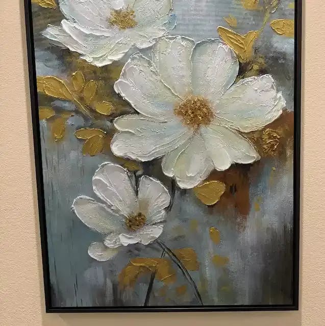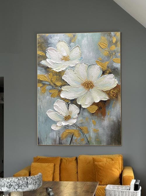 "Golden Blossoms" by Elodie Dubois is a captivating vertical painting that celebrates the elegant beauty of nature. The textured impasto strokes create stunning white flowers with delicate gold accents, bringing a touch of Parisian romance and artistic sophistication to any space. Imagine this piece transforming your living room into a serene and inviting oasis, its soft color palette and textured composition inspiring a sense of tranquility and connection with nature. This artwork is equally enchanting in a bedroom or hallway, adding a touch of refined elegance and a sense of calm to any wall. The vertical orientation enhances the sense of height and draws the eye upward, making it a perfect addition to spaces with taller walls.