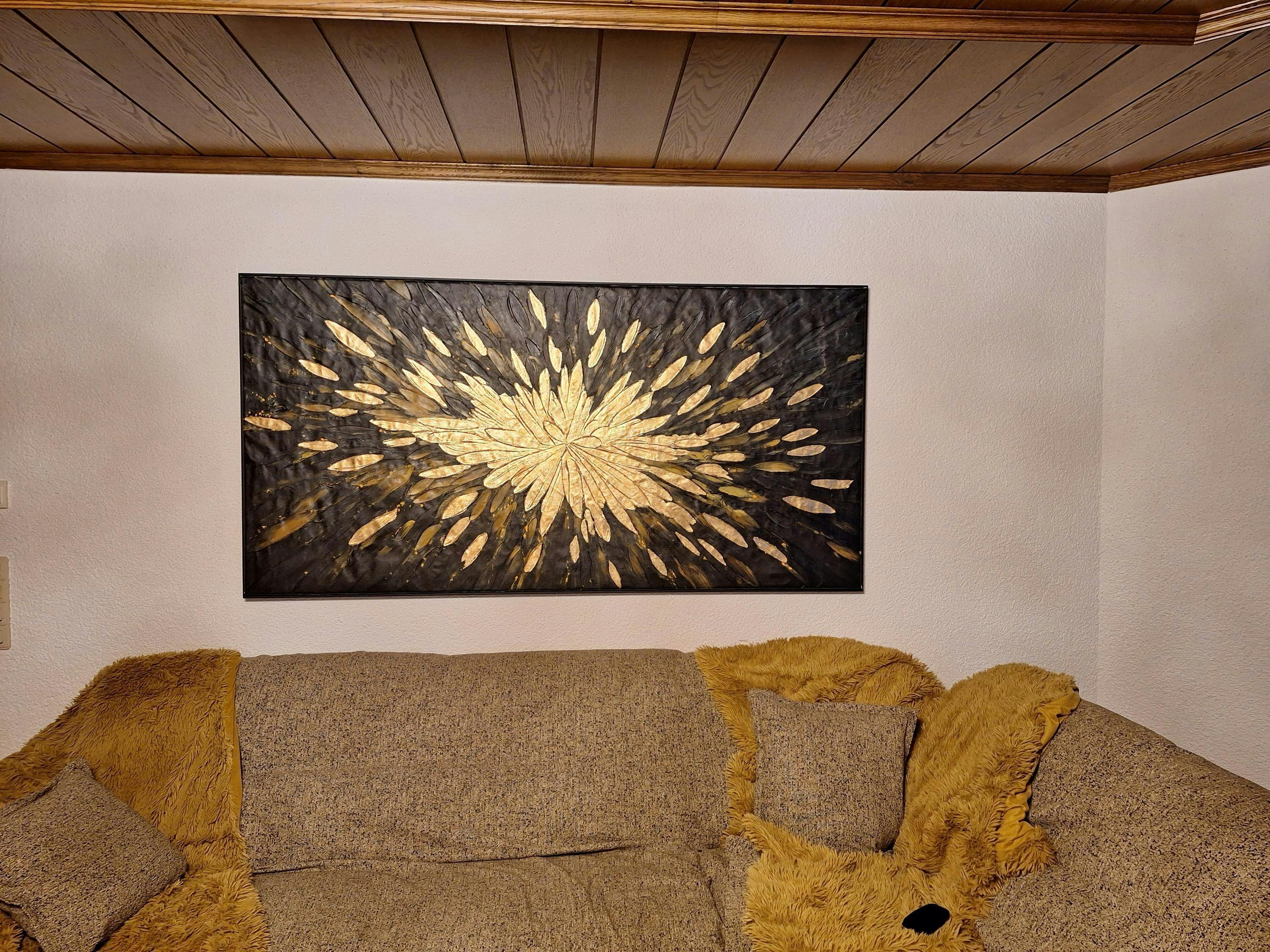 Golden Burst by Willow Davies captures the dynamic energy of a golden explosion against a dramatic black background. This horizontal artwork brings a touch of modern sophistication and abstract charm to any living room, office, or hallway. Her bold use of color and dynamic compositions create a sense of energy and excitement. The textured application of gold paint adds depth and visual interest, creating a captivating focal point.