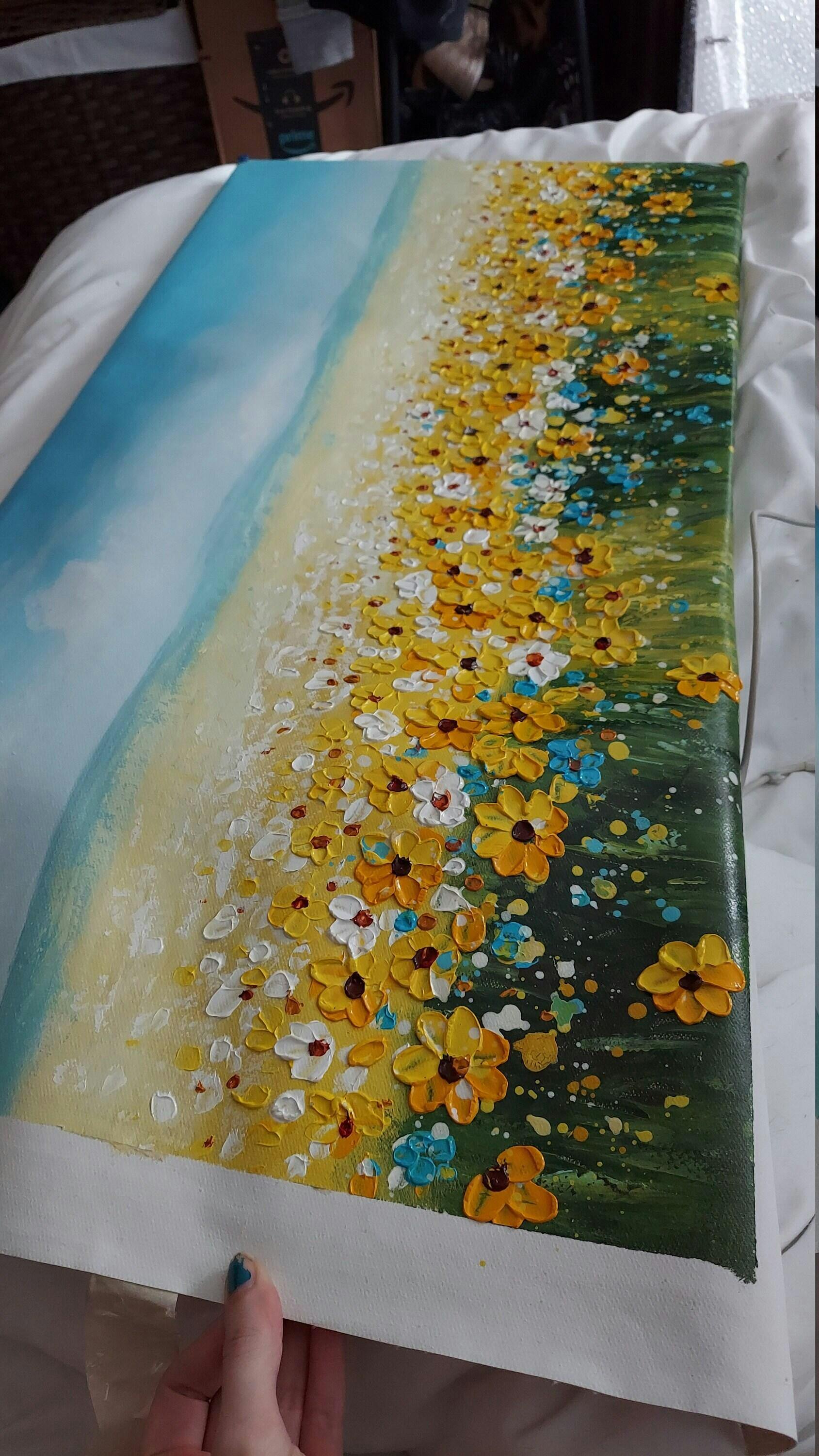 "Golden Hour Bloom" invites you to bask in the warm glow of a wildflower field under a bright blue sky. This original panoramic oil painting captures the serene beauty of nature with vibrant yellow blossoms, soft white clouds, and delicate brushwork. Handcrafted with premium paints, this piece is perfect for adding a touch of joyful energy and natural tranquility to any space.