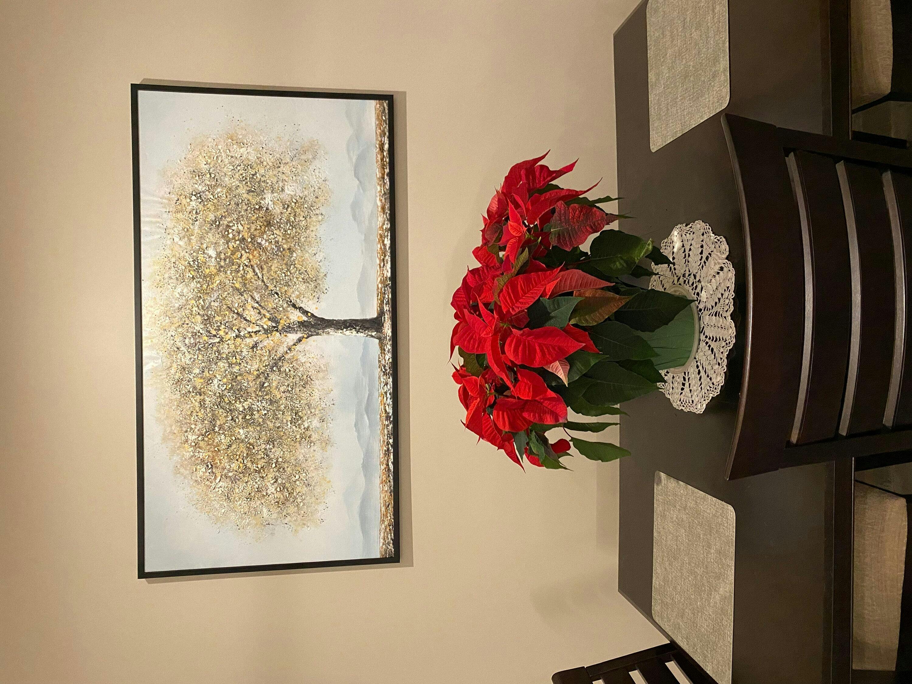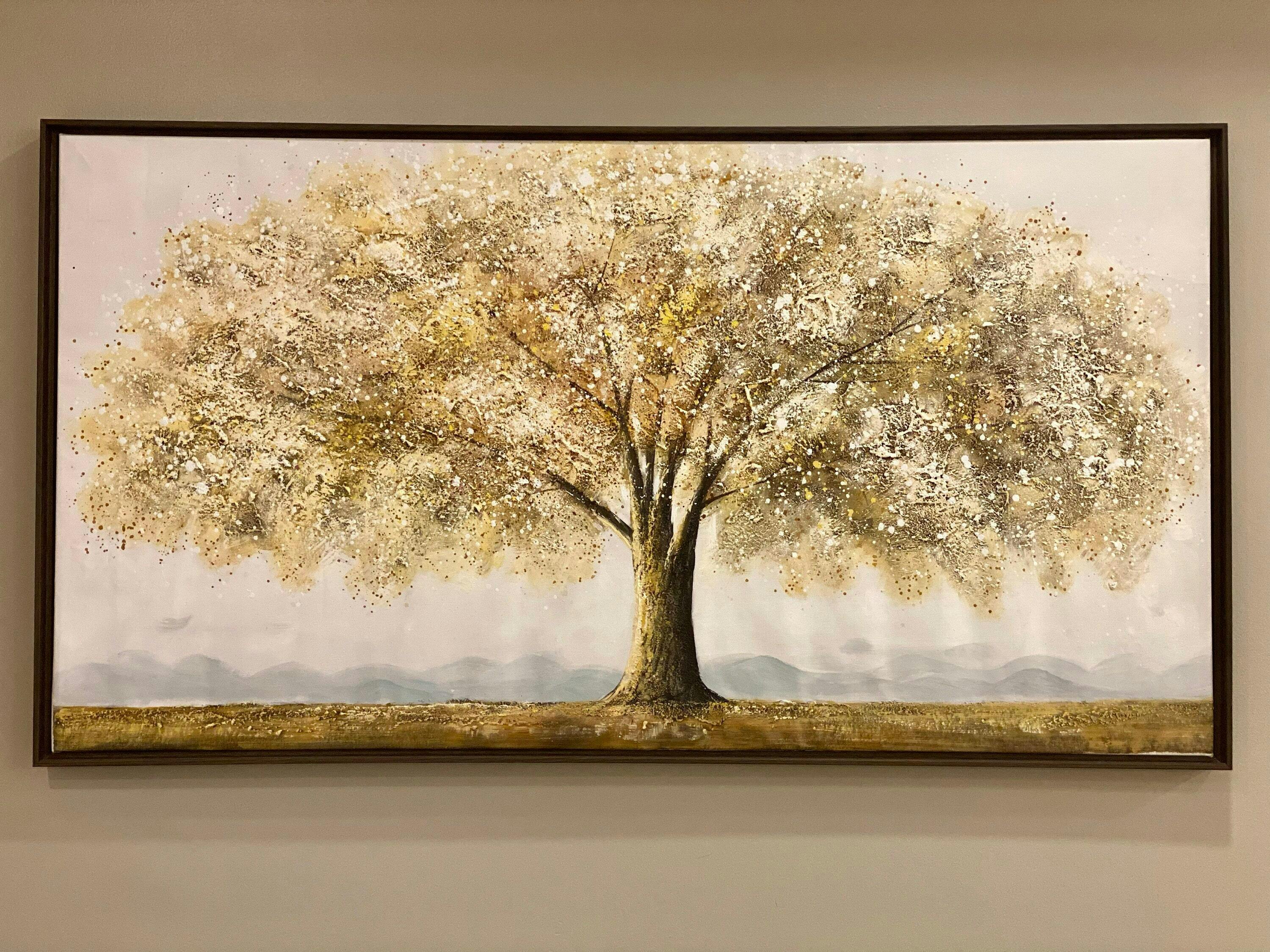 Golden Tree presents a majestic tree with textured, golden leaves, standing against a serene grey backdrop. This horizontal artwork brings a touch of peaceful ambiance and natural elegance to any living room, bedroom, or hallway. The textured application adds depth and visual interest. The gold and grey color palette creates a sophisticated and calming atmosphere.