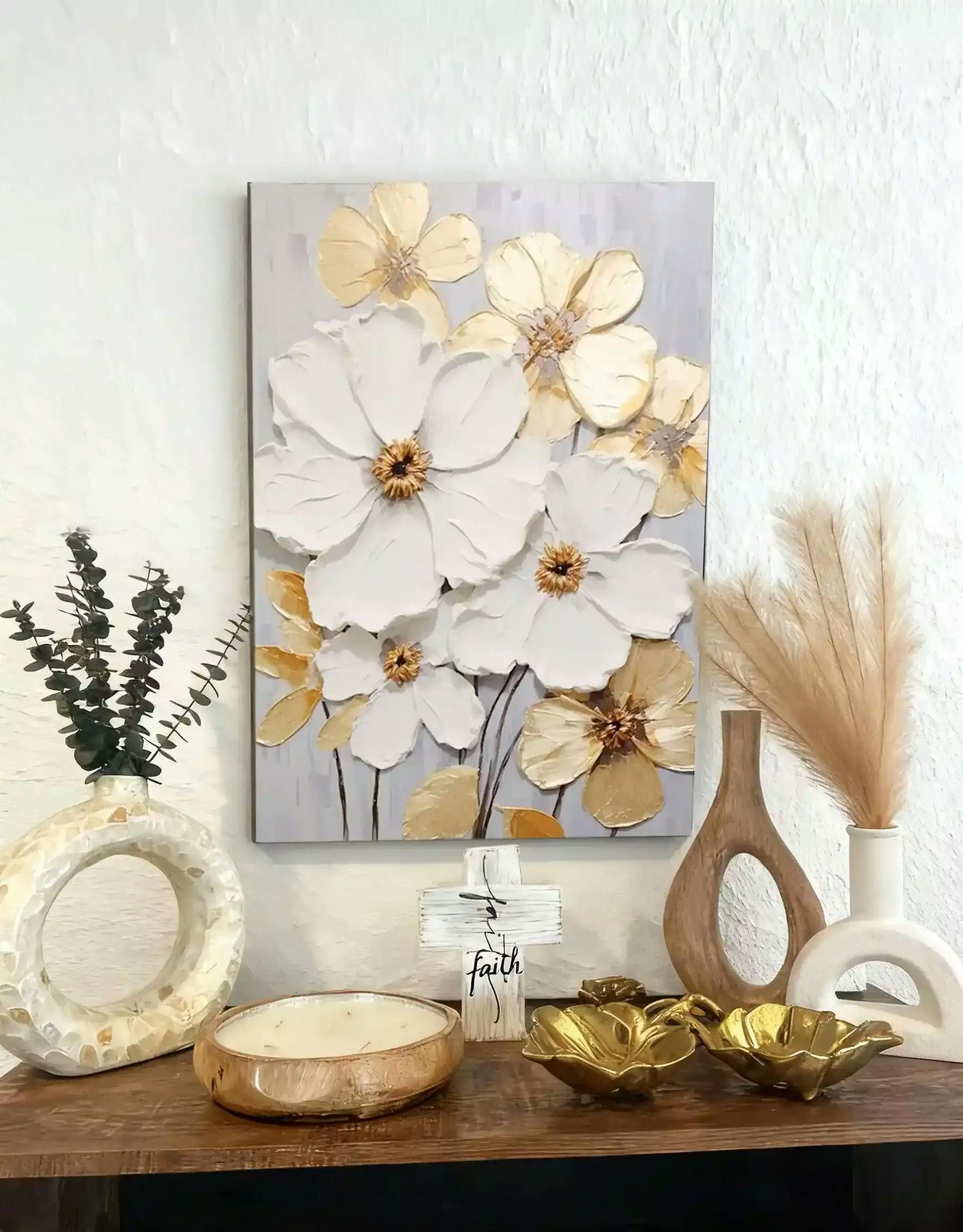 "Golden Whispers" by Elodie Dubois is a captivating painting that evokes a sense of timeless elegance and delicate beauty. The textured brushstrokes and luxurious hues of gold and white create a sophisticated atmosphere, inviting viewers to immerse themselves in the enchanting world of flowers. This vertical canvas is perfect for adding a touch of artistic refinement and a sense of gentle serenity to any living room, bedroom, or hallway. Imagine this piece transforming your living room into a luxurious sanctuary, its textured surface and shimmering gold accents evoking the delicate fragrance and velvety touch of precious blossoms. The vertical format emphasizes the graceful composition and the textured details, creating a sense of serene immersion.