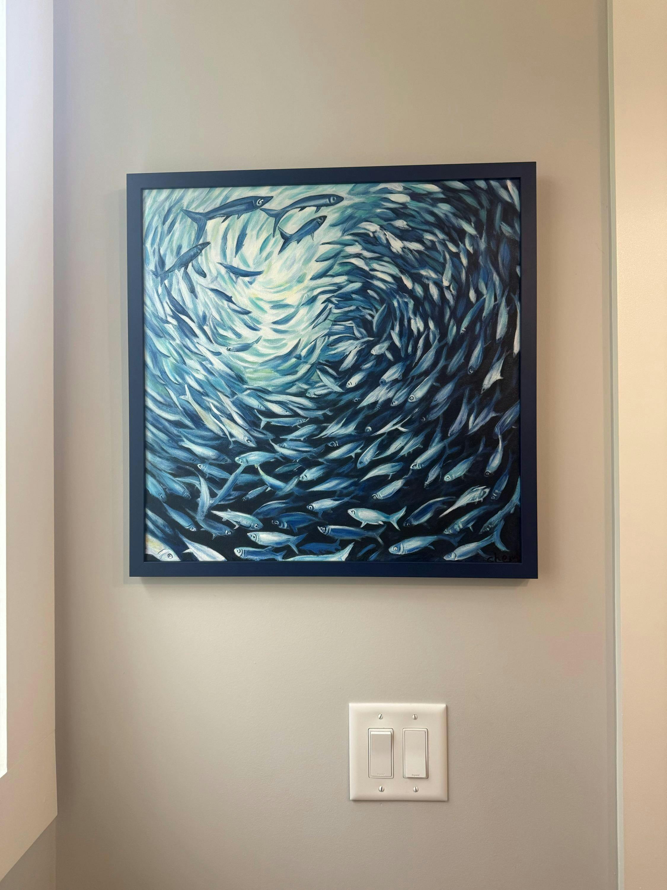 Oceanic Whirl captures the dynamic movement of a school of fish in a swirling formation. This square artwork brings a touch of vibrant energy and marine life to any living room, bedroom, or office. The deep blue hues create a captivating and immersive underwater experience.