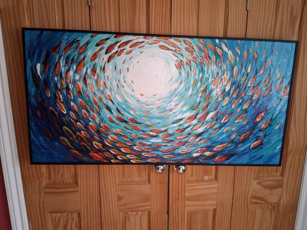 OCEANIC WHIRL: Dynamic School of Fish Painting, Horizontal Wall Art