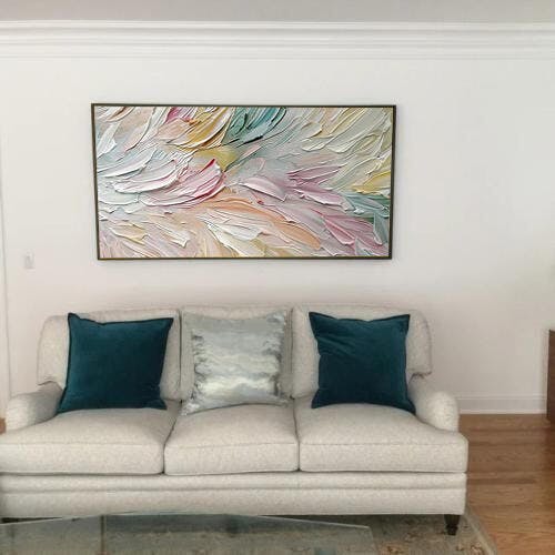 Pastel Dream by Isabella Rossi embodies textured beauty and a dreamy, ethereal quality. This horizontal artwork brings a touch of soft sophistication and artistic flair to any living room, bedroom, or hallway. Her signature impasto style adds depth and tactile interest to the artwork. The soft, blended hues create a sense of calm and tranquility, while the dynamic composition adds a touch of visual interest. This piece is perfect for adding a touch of subtle elegance and artistic expression to any space.