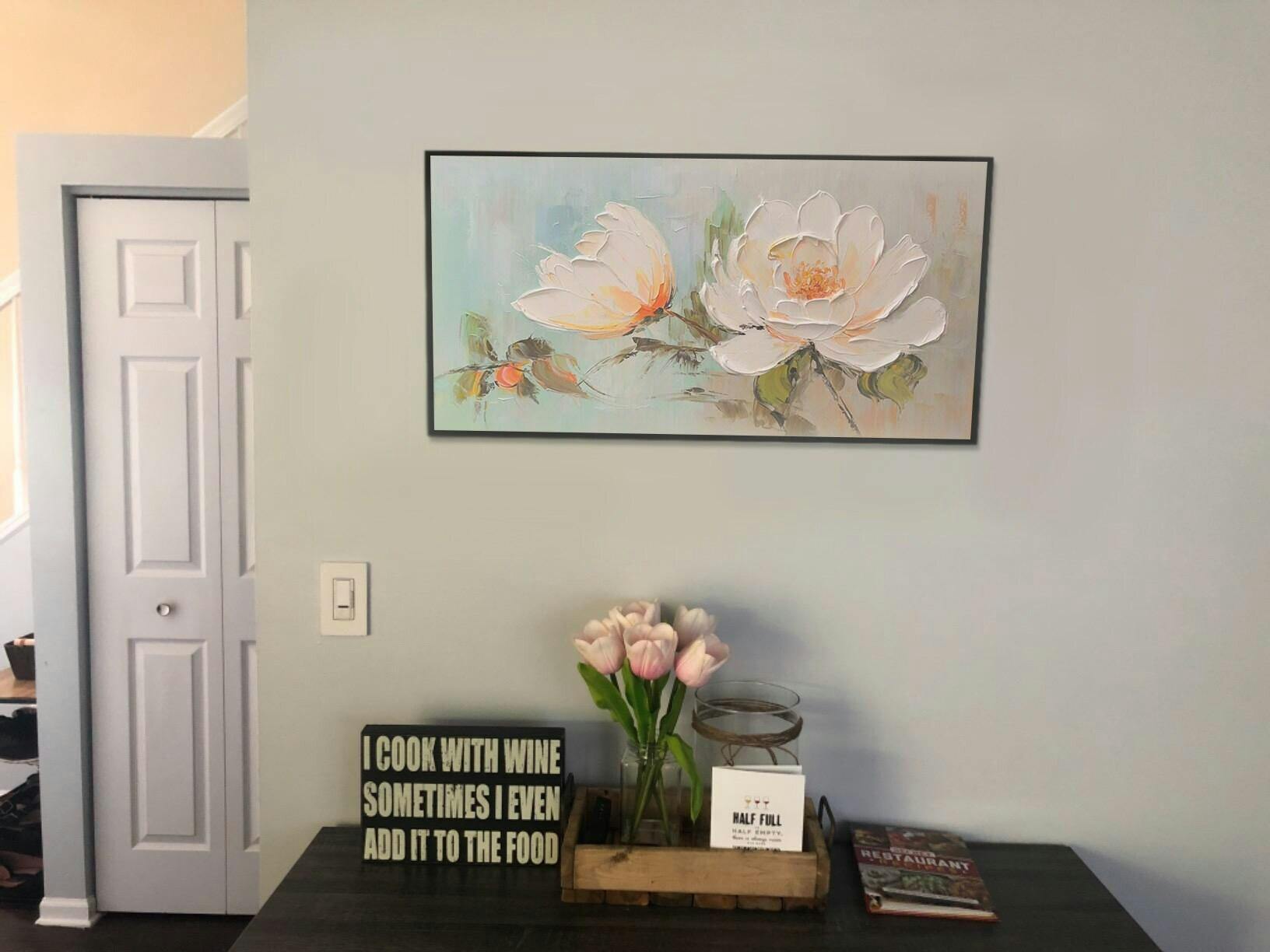 Cute painting I got for a rental. I was a little nervous about it but I think adds a lot to the space. It was easy to install and felt like good quality for what I got. It didn’t feel to heavy and the supplies to hang it felt sufficient.