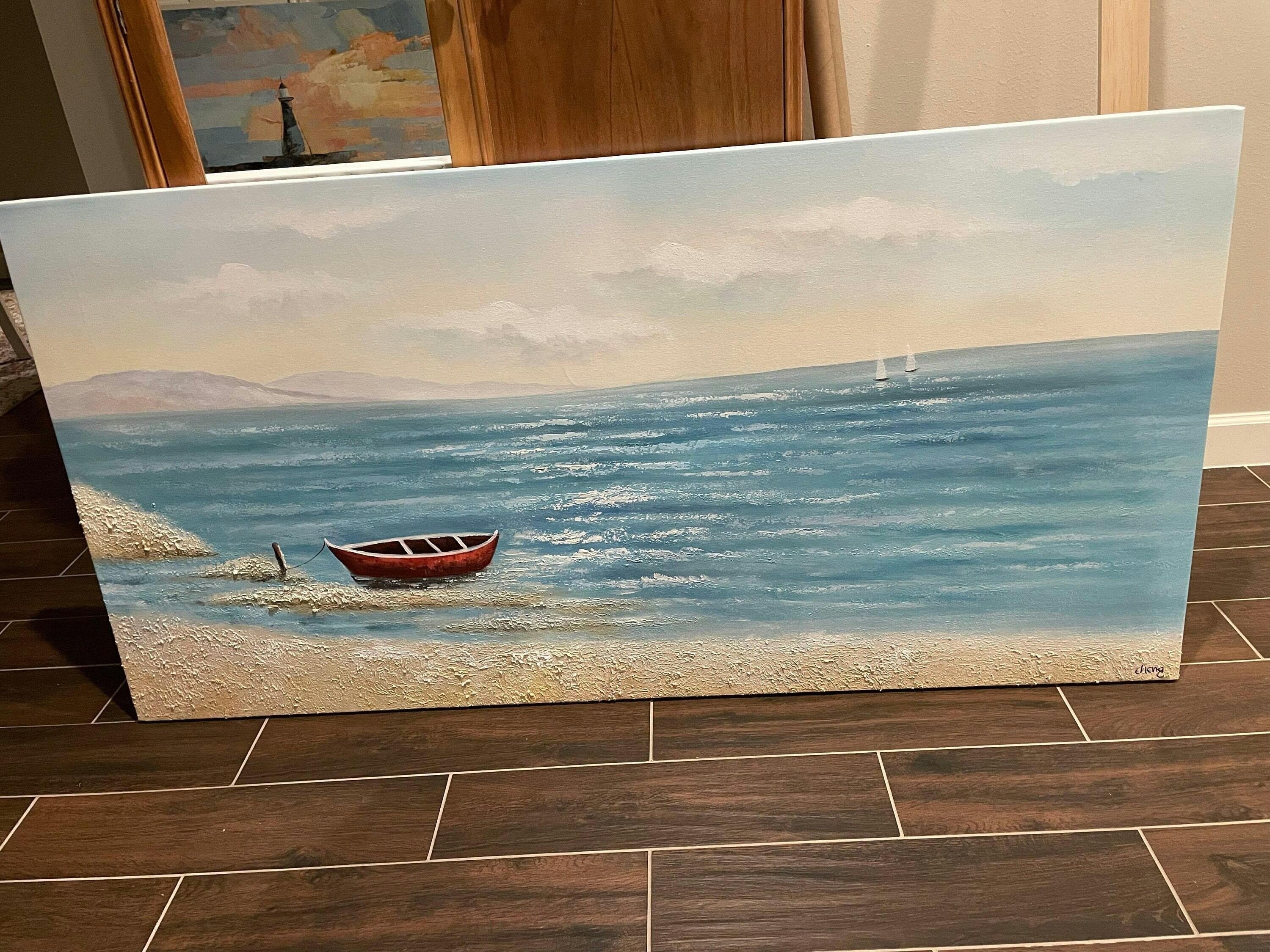 RED BOAT AT THE SHORE: Tranquil Coastal Landscape Painting