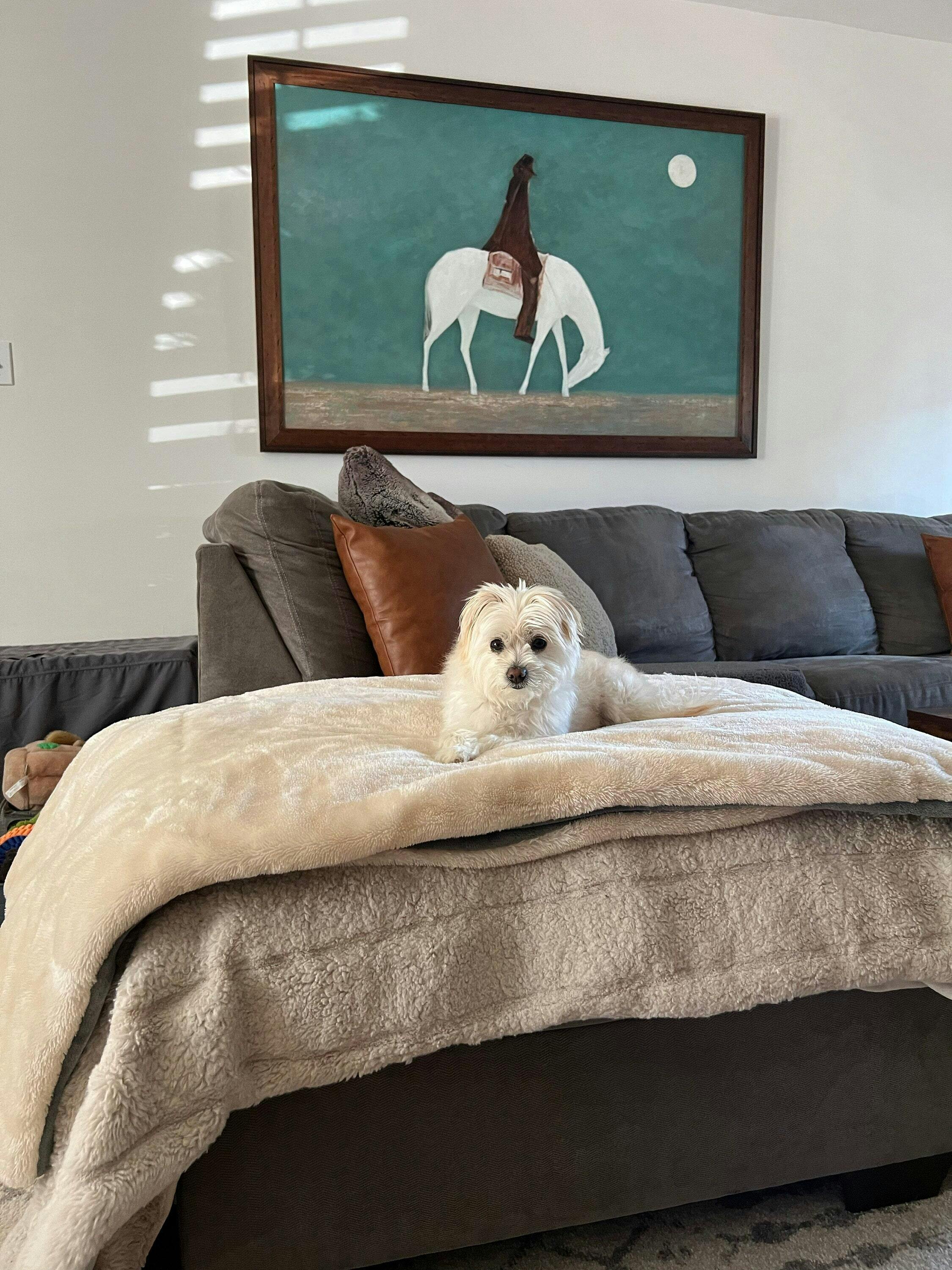 Cute painting I got for a rental. I was a little nervous about it but I think adds a lot to the space. It was easy to install and felt like good quality for what I got. It didn’t feel to heavy and the supplies to hang it felt sufficient.