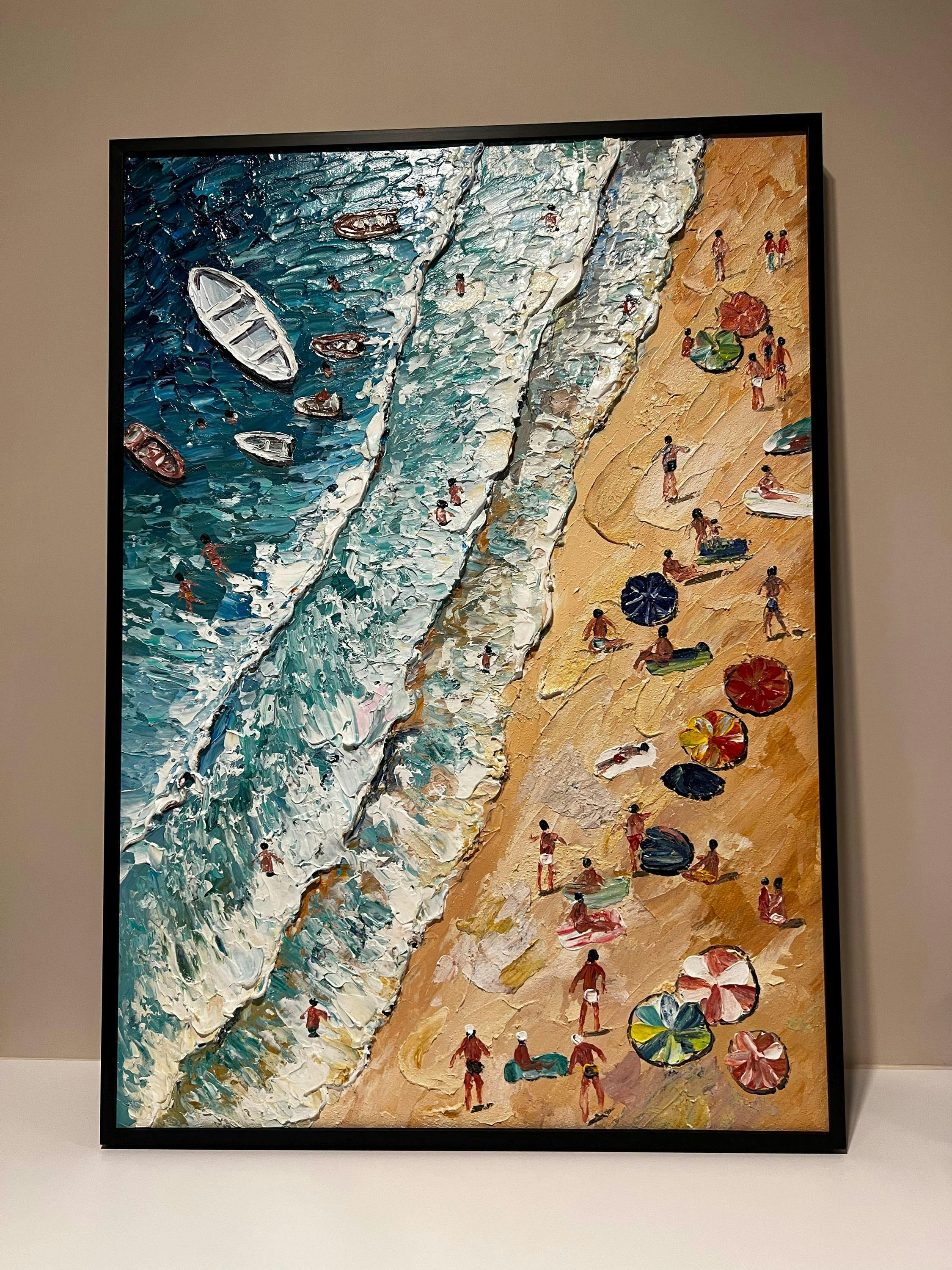 SUN-KISSED SHORES: Textured Beach Scene Painting with Figures