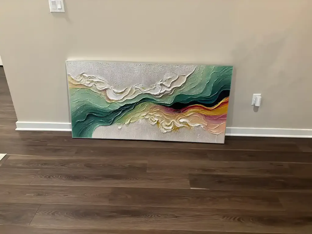 Let your walls breathe with the dynamic energy of 'Terraflux'. This piece is not just seen, but felt. Thick, sculptural strokes of paint carve a landscape of emotion, where tranquil teals meet sun-kissed golds in a flowing, organic dance. It’s an invitation to trace the journey of the artist's palette knife, to feel the surge of creativity. Imagine this captivating texture as the focal point of your living room or the inspiration in your office, transforming your space into a sanctuary of modern sophistication and tactile beauty, sparking conversation and inspiring a sense of wonder.