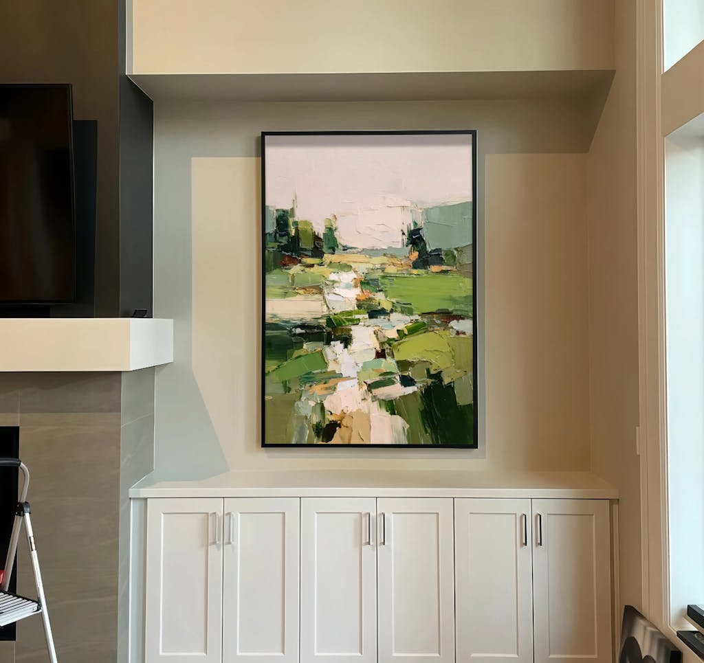 Let your eyes wander down the "Verdant Path," a journey through a landscape reimagined. Thick, confident strokes of oil paint, applied with a palette knife, sculpt a scene of rolling green fields and soft, earthy tones. This isn't just a painting; it's an experience. It's the feeling of a fresh spring morning, the tranquility of a hidden meadow brought into your home. This piece transforms your space into a sanctuary of peace and modern sophistication, a daily escape into the beauty of nature's abstract form.