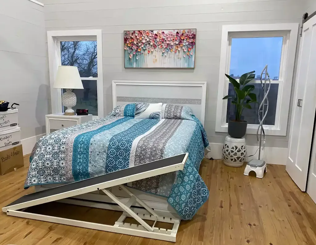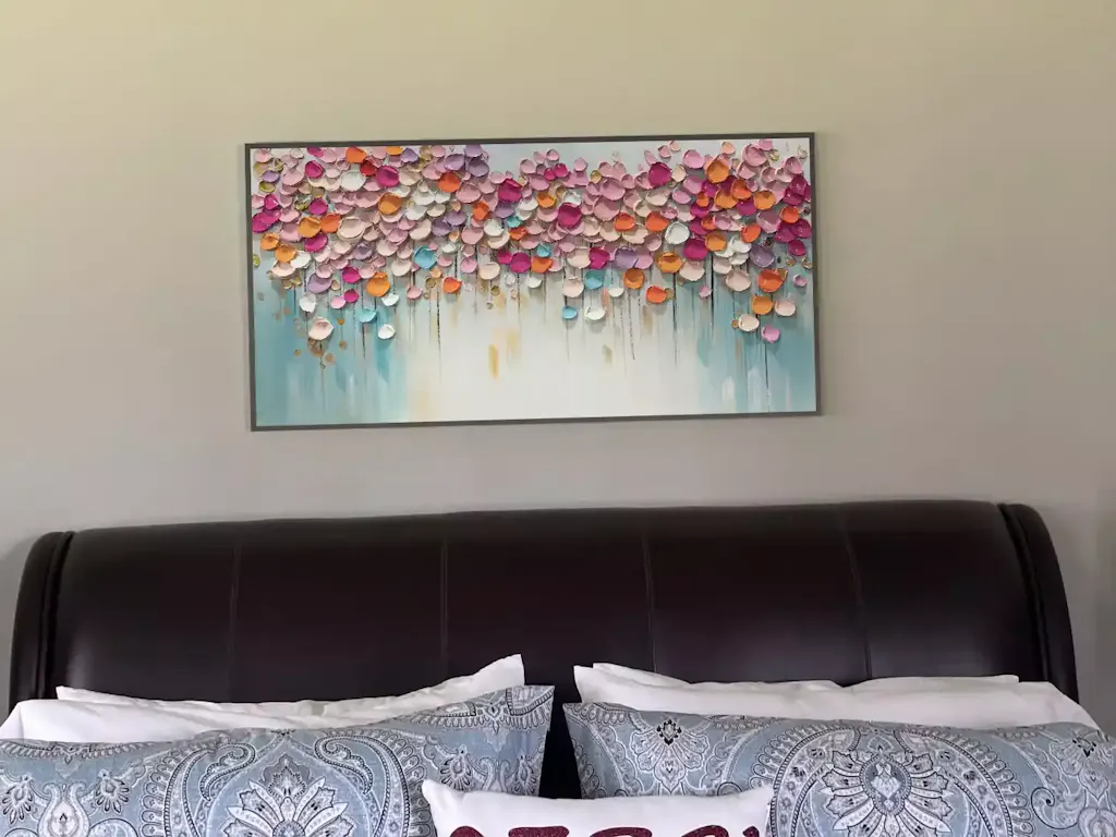 It looks great over our bed and picks up the colors in our quilt. It’s light enough to use Command Stickers to hang without putting nail holes in the wall. It was reasonably priced and I love it.