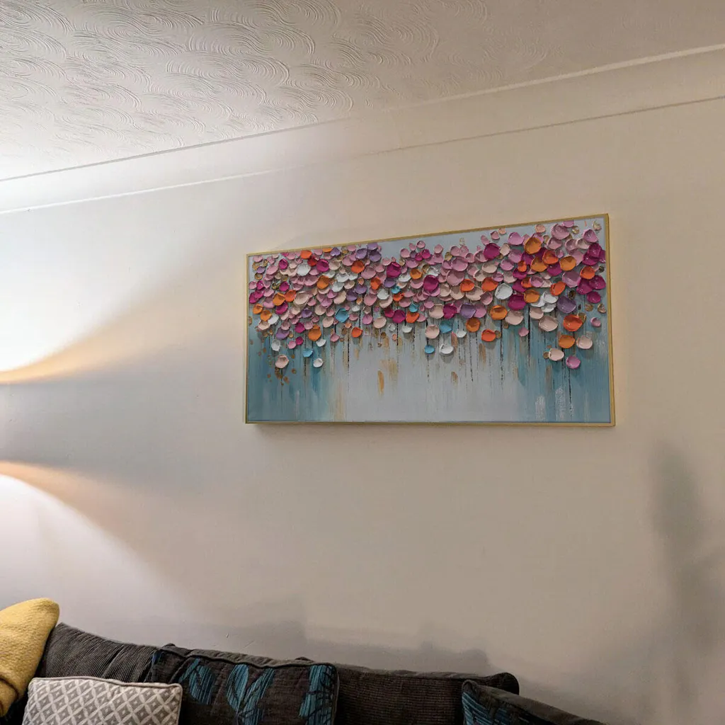 Immerse yourself in the vibrant beauty of this hand-painted oil painting, showcasing captivating pink and orange floral patterns. Each meticulous brushstroke ensures a unique masterpiece, adding life and energy to any space. Crafted with high-quality oil paints, this painting brings rich, vivid colors and modern elegance to your decor. Perfect for living room wall art, it becomes a conversation piece, impressing guests and offering lasting beauty. Elevate your home with this stunning artwork.